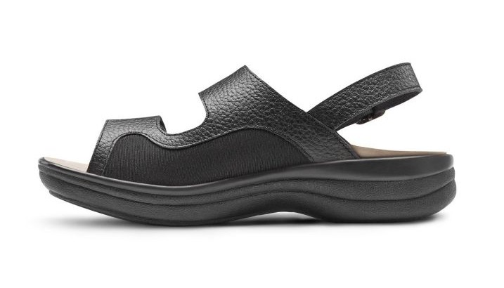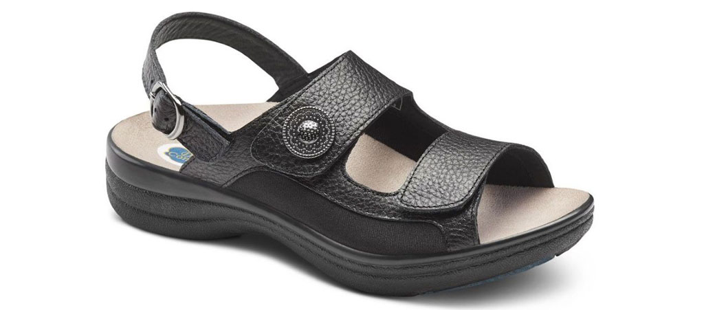 The Lana sandal is both comfortable and functional. With stretchable Lycra® sides, the sandal helps accommodate bunions and other foot deformities. Features include a stylish button accent, a removable footbed for custom orthotics, contact closures over the forefoot and a buckled closure on the heel.